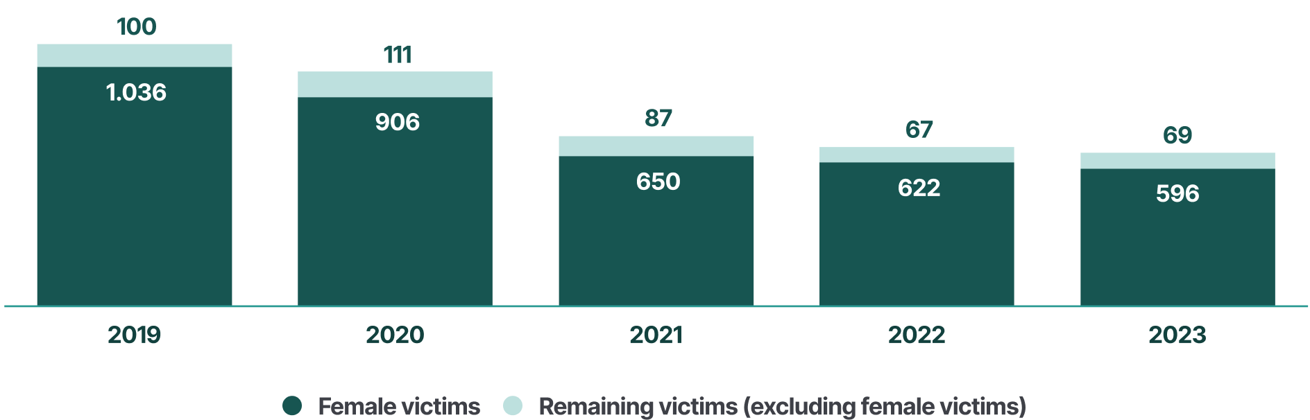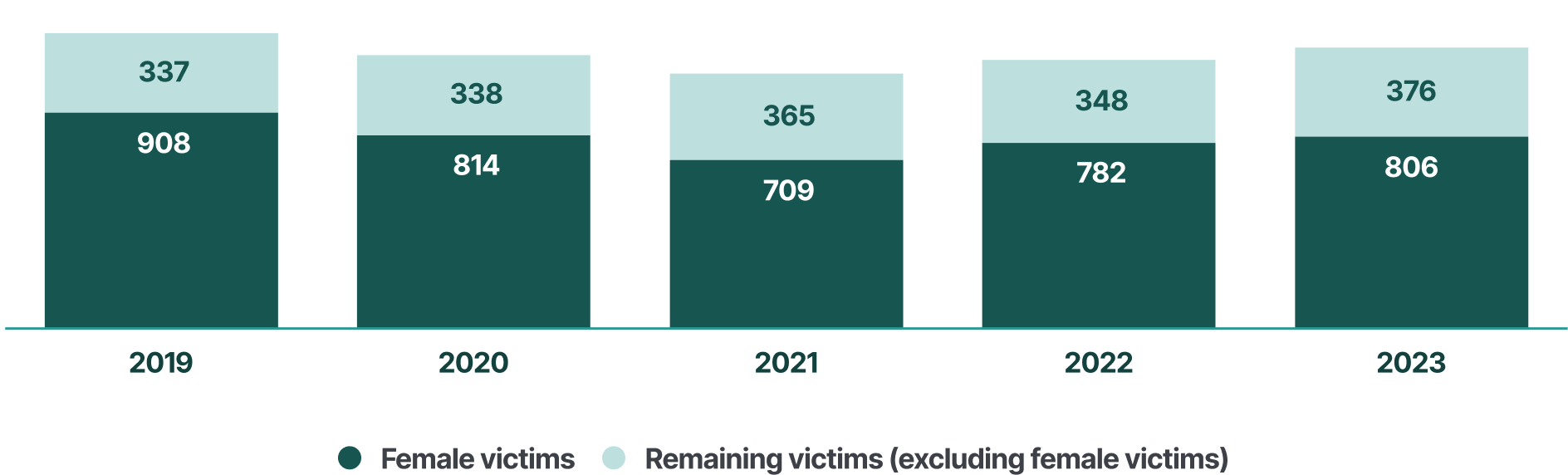 Women represent most victims of homicide committed by intimate partners (73 %), based on data from 2023 (8 out of 11). In 2023, women represented half of victims of domestic homicide recorded by police (11 out of 22), and 41 % of victims of any homicide (31 out of 75).