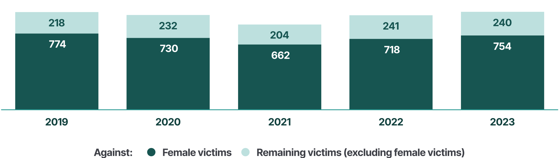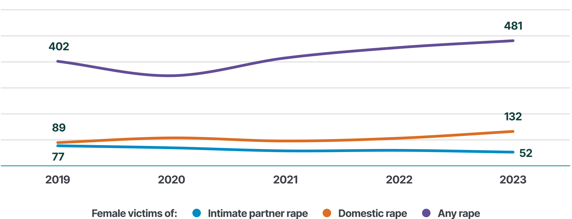 In 2023, 481 female victims of rape were recorded by police. In the same year, the police recorded 132 women victims that were harmed by domestic perpetrators, and 52 that were harmed by intimate partners.