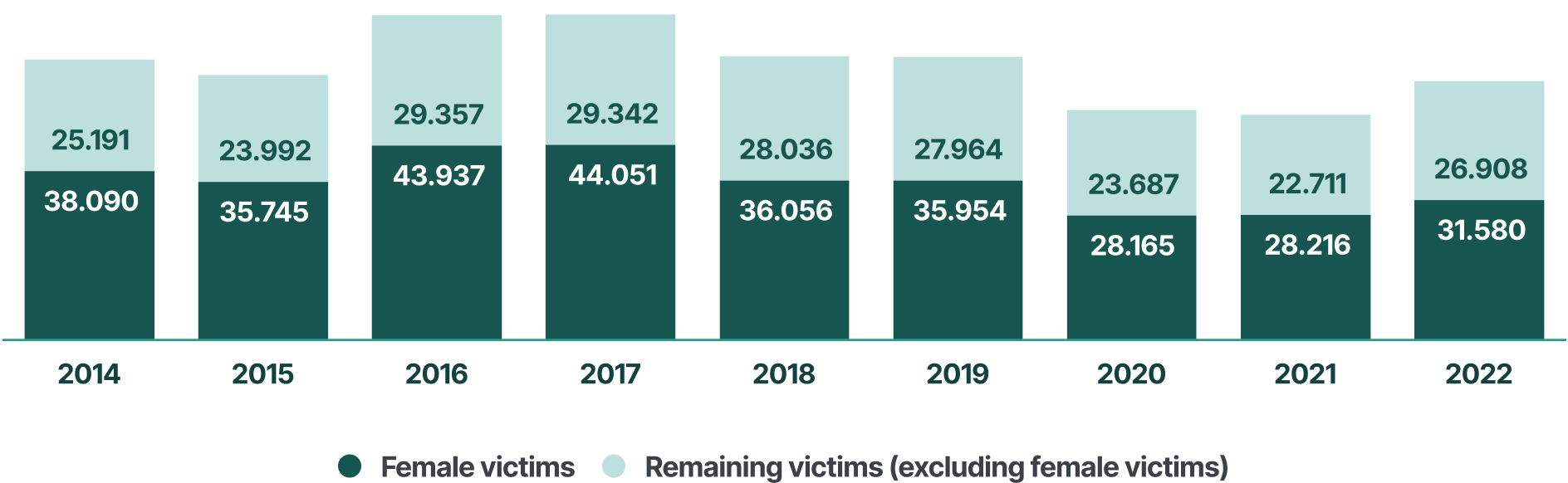 Figure 2 Annual number of female and total victims of violence in any relationship (Indicator 1), 2014–2022