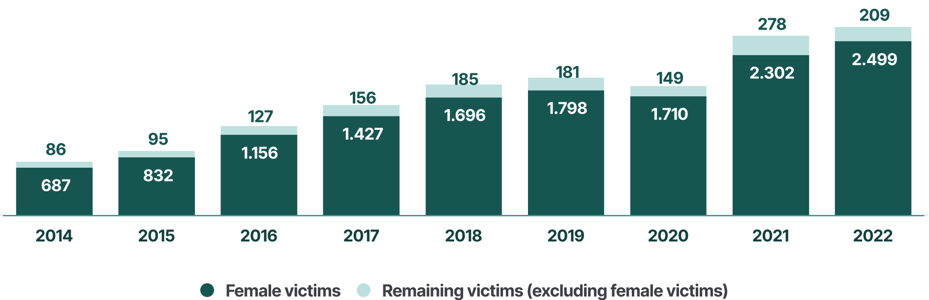 In 2022, 2,499 women victims of rape committed by any perpetrator were recorded by police. Women represented almost all (92 %) of rape victims recorded during the year (2,499 out of 2,708).