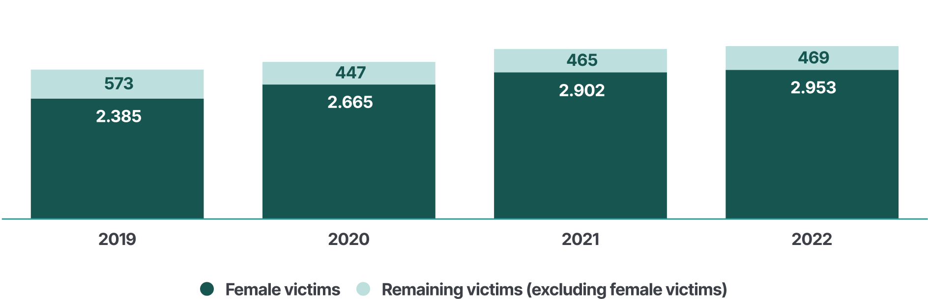 In Hungary, women represent most victims of intimate partner violence recorded by police (86 % in 2022). In 2022, police recorded 2,953 women victims of violence committed by an intimate partner.