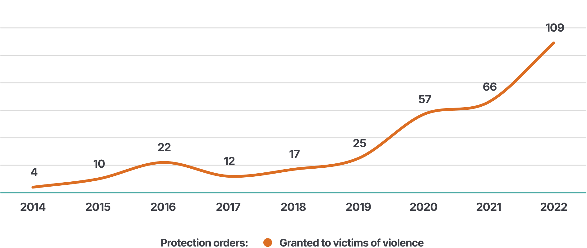 The annual number of protection orders granted to victims of violence increased notably between the years 2014 and 2022 (from 4 to 109). This rise may be due, in part, to judicial reforms, as well as an increase in awareness about legal protections among victims, and improved access to services helping victims obtain these protection orders.
