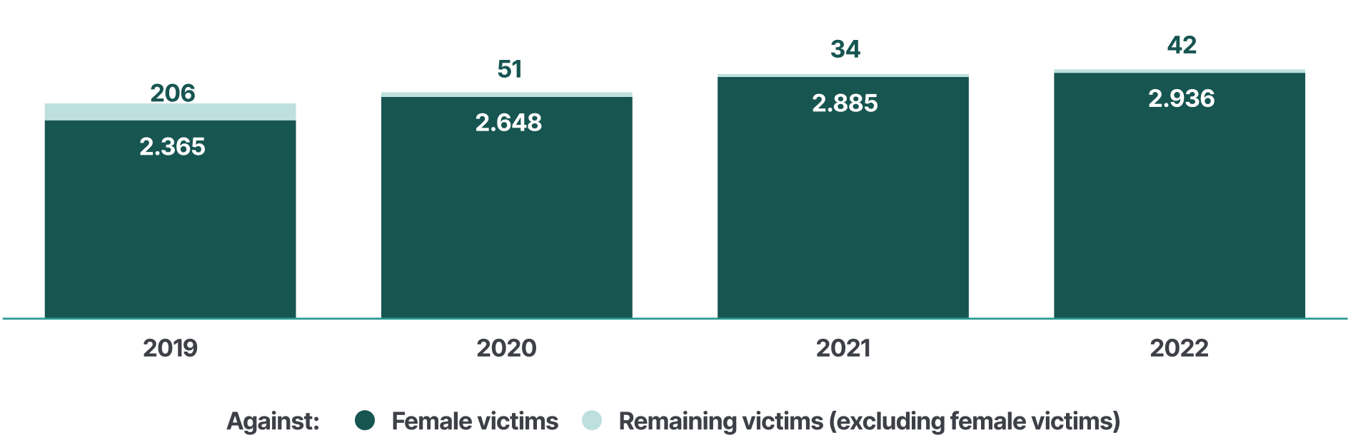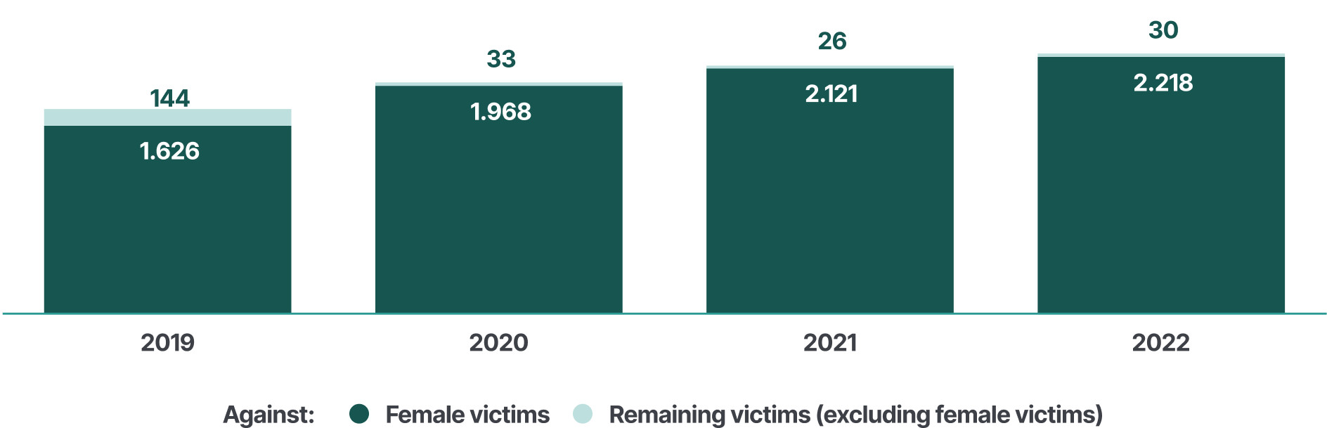 In 2022, 2,218 men were prosecuted for intimate partner violence against women. Of the men prosecuted for intimate partner violence that year, 99 % committed crimes against women (2,218 out of 2,248).