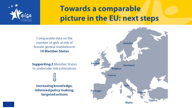 This research built upon EIGE’s 2015 study estimating girls at risk of female genital mutilation in Ireland, Portugal and Sweden.  EIGE’s risk estimation methodology was applied in a further six countries: Belgium, Cyprus, France, Greece, Italy and Malta.  This research provides comparable data and the assessment of trends within the EU.