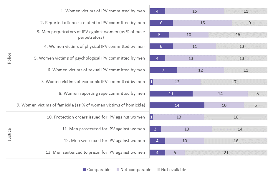 Figure 1: Number of jurisdictions with comparable, not comparable, and not available data on intimate partner violence (IPV), collected from police and justice national administrative sources from 2014 until 2018.