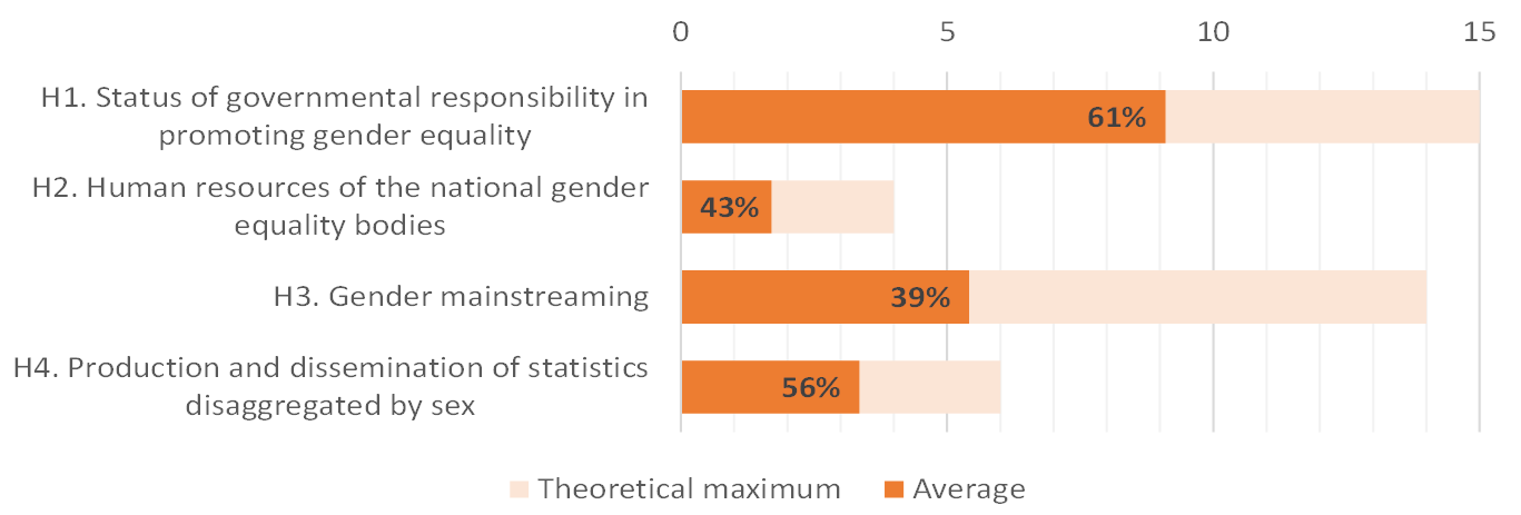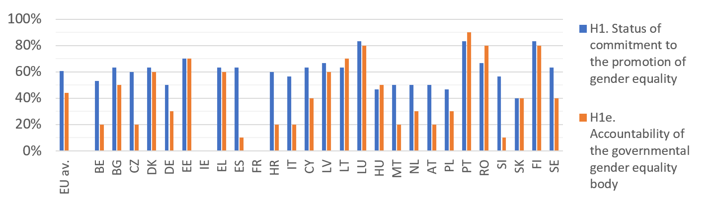 Indicator H1 considers the institutional commitment to gender equality through five sub-indicators that focus on where and how responsibility for gender equality is situated within government, the scope of the mandate of both governmental and independent bodies, and the extent to which gender equality goals and objectives are set out in a clear strategy and corresponding action plan.
