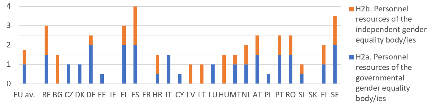 Effective national machineries need adequate resources, but data collected under Indicator H2 suggest that many gender equality bodies are under-resourced. Only in Spain are both the governmental and independent bodies resourced sufficiently to score the maximum possible under this indicator.