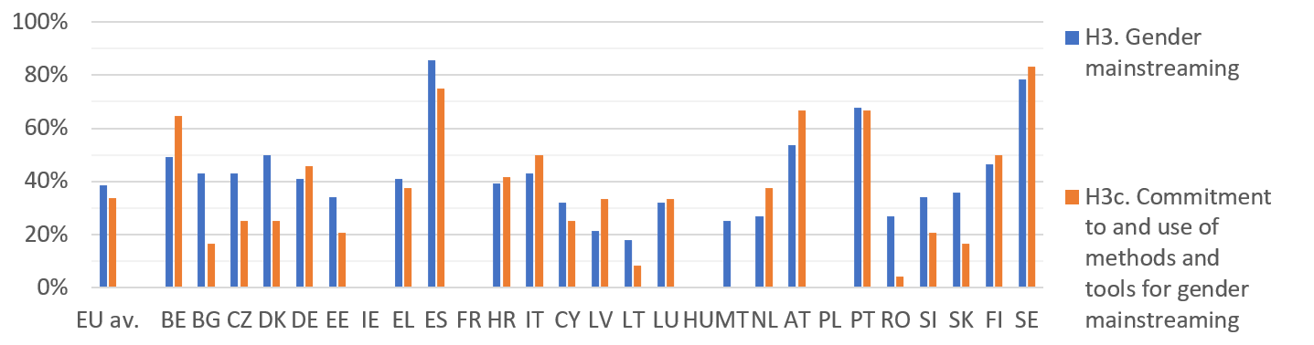 A significant factor in these low scores is the limited use of methods and tools to support gender mainstreaming evidenced by sub-indicator H3c (average 34%). For example, gender budgeting was reported to be “practically an unknown concept” in 11 Member States and “still in its foundational stages” in a further five. The new sub-indicator H3d also shows that few countries have taken note of the OECD recommendation to involve independent gender equality bodies in policy consultations.
