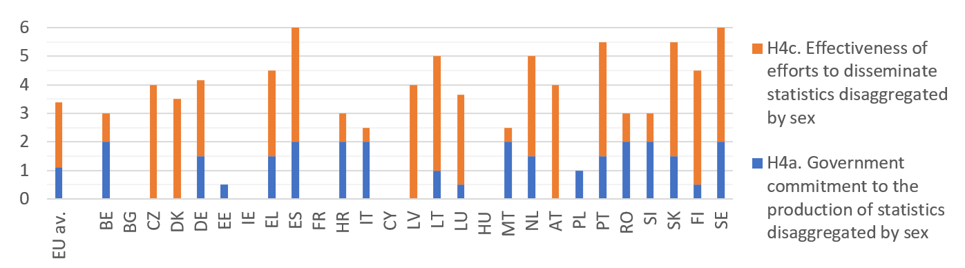 Comprehensive data on the differences between women and men are crucial both as an evidence base for policy-makers and to promote awareness of the current situation and trends. The results for indicator H4 show mixed results in this respect (average 3.4 / 6 or 56%).